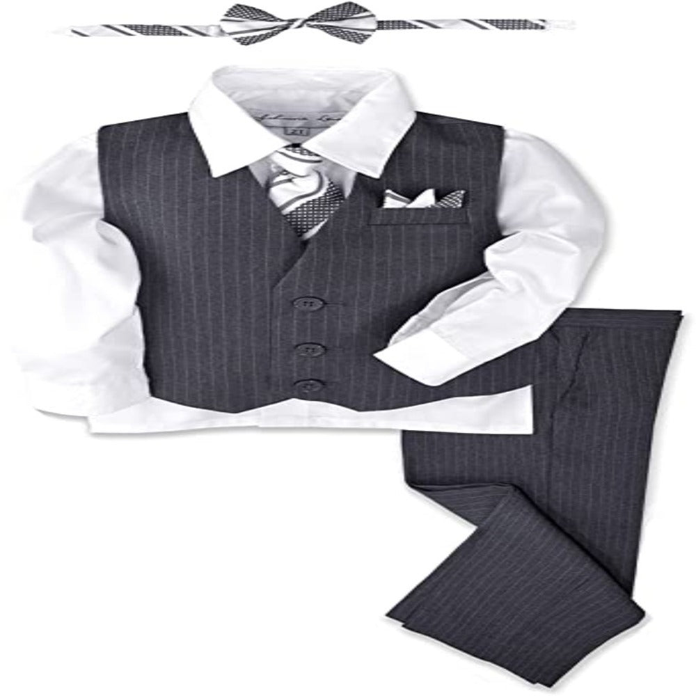 Cinq Pieces ensemble. un gillet, un pantalon, une chemise, une cravate et un noeud de couleur grise